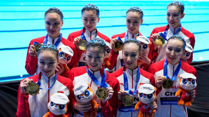 Китайская сборная по синхронному плаванию взяла золото в произвольной программе на чемпионате мира по водным видам спорта, который проходит в Сингапуре.