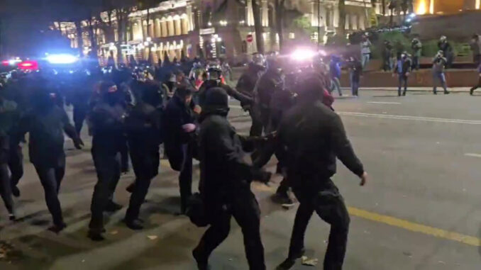 На транслируемых кадрах можно увидеть, как провокаторы держат в руках грузинские и украинские флаги, затем они сжигают флаг России. У них в руках также можно заметить плакаты с антироссийскими лозунгами.